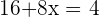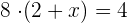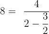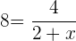 Zuerst nehmen wir beide Seiten der Gleichung mit (2+x) mal, damit die 4 alleine steht. Dann lösen wir in der zweiten Zeile die Klammer nach dem Distributivgesetz auf. Nun ziehen wir auf beiden Seiten die 16 ab (3. Zeile), dividieren durch 8 (vierte Zeile), und wir erhalten den Wert der Variablen x. Durch Kürzen erhalten wir