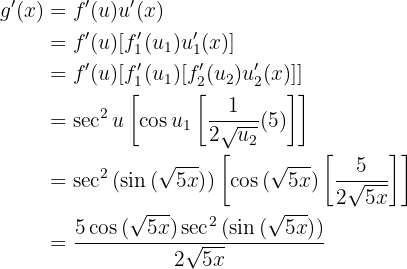 In diesem Fall haben wir eine dreifache Zusammensetzung, daher wenden wir die Kettenregel dreimal an. Als Erstes nehmen wir