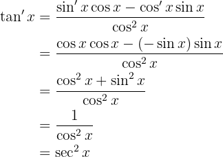 Um seine Ableitung zu berechnen, reicht es daher aus, die Ableitungsformel für Quotienten von Funktionen und die Ableitung von Sinus und Kosinus zu kennen. Fahren wir nun mit der Ableitung fort
