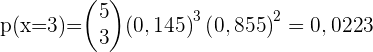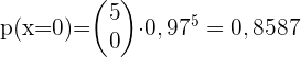 Ein Labor gibt an, dass ein Medikament bei 3 von 100 Patienten Nebenwirkungen verursacht. Um diese Behauptung zu überprüfen, wählt ein anderes Labor nach dem Zufallsprinzip 5 Patienten aus, denen es das Medikament verabreicht.