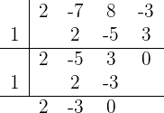 Wir wenden das Horner-Schema an, da es sich um eine Gleichung 3. Grades handelt. Die Divisoren von