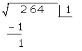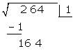 Hinter den Rest schreiben wir die nächste Zifferngruppe des Radikanden (64). Wir trennen die erste Ziffer rechts (4) von der gebildeten Zahl ab und teilen den Rest (16) durch das Doppelte der Zahl im Kästchen, also durch 2 · 1=2