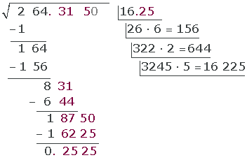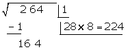 Das Verfahren liefert ganzzahlige Lösungen, d. h. es findet das Quadrat, das am nächsten links von der Zahl 264 liegt, also 16², und ermittelt den Betrag, der benötigt wird, um die betreffende Zahl 8 zu erreichen.