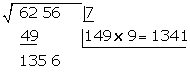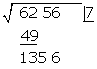 Hinter den Rest schreiben wir die nächste Zifferngruppe des Radikanden (56). Wir trennen die erste Ziffer rechts (6) von der gebildeten Zahl ab und teilen den Rest (135) durch das Doppelte der Zahl im Kästchen, also durch 2 · 7=14