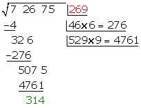Mit der ersten Ziffer (7) berechnen wir die Zahl, die dem Quadrat der Ziffer am nächsten kommt; sie darf nicht größer sein als die Ziffer