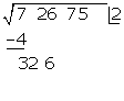 Hinter den Rest schreiben wir die nächste Zifferngruppe des Radikanden (26). Wir trennen die erste Ziffer rechts (6) von der gebildeten Zahl ab und teilen den Rest (32) durch das Doppelte der Zahl im Kästchen, also durch 2 · 2=4