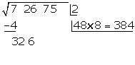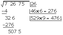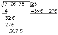 Hinter den Rest schreiben wir die nächste Zifferngruppe des Radikanden (75). Wir trennen die erste Ziffer rechts (5) von der gebildeten Zahl ab und teilen den Rest (507) durch das Doppelte der Zahl im Kästchen, also durch 2 · 26=52
