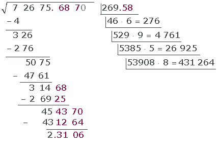 Bei 6 ist das Ergebnis kleiner als der Rest, also schreiben wir 6 als zweite Ziffer der Wurzel