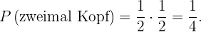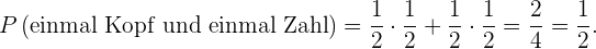 Die Wahrscheinlichkeit, dass wir einmal Kopf und einmal Zahl erhalten, ist die Wahrscheinlichkeit, zu erhalten. Außerdem handelt es sich wie in den vorangegangenen Abschnitten um unabhängige Ereignisse. Da die Wahrscheinlichkeit, dass jede Münze Kopf oder Zahl zeigt,