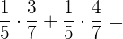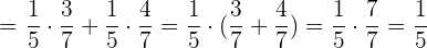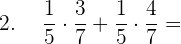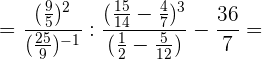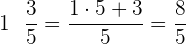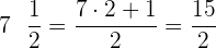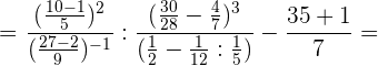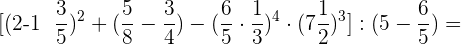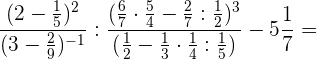 Wir führen die in den Klammern angegebenen Rechenschritte durch und in der Klammer des zweiten Nenners müssen wir zuerst multiplizieren und im nächsten Schritt dividieren. $5 \frac{1}{7}$ ist eine gemischte Zahl, also belassen wir denselben Nenner (7) und der Zähler ist die Summe aus der Multiplikation der ganzen Zahl (5) mit dem Nenner (7) plus dem Zähler der gemischten Zahl (1).