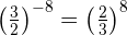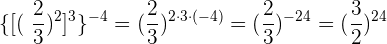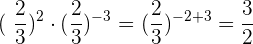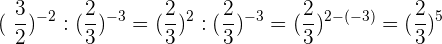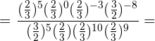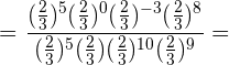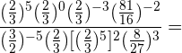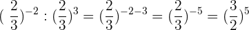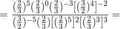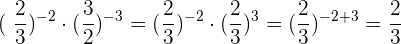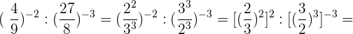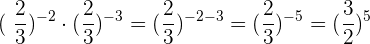 Wir berechnen die Potenzen und bedenken, dass wir bei einem Bruch, der auf eine negative Zahl erhöht wird, den Zähler in den Nenner umwandeln und dann auf den Exponenten erhöhen müssen: