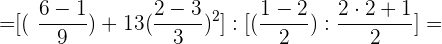 Wir führen die entsprechenden Rechenschritte in den Zählern durch. Innerhalb der 2. eckigen Klammer lösen wir die Klammer auf und aus der eckigen Klammer wird eine runde Klammer: