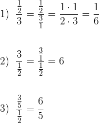 Um jede der Divisionen durchzuführen, denken wir daran, dass die Extremwerte (oben und unten) multipliziert werden. Das Produkt ist der Zähler, während das Produkt der inneren Werte den Nenner bildet. So erhalten wir folgende Ergebnisse: