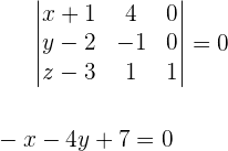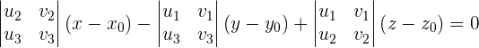 Damit können wir die folgende Determinante (gleich null) lösen und erhalten die Ebenengleichung in impliziter oder allgemeiner Form: