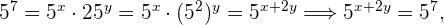Wende bei der zweiten Gleichung das Potenzgesetz an, um die Summen und Subtraktionen in den Exponenten als Produkt und Bruch darzustellen: