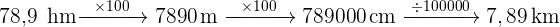 Wenn wir eine Einheit in eine andere Einheit umrechnen möchten, müssen wir: multiplizieren (wenn von einer größeren Einheit zu einer kleineren Einheit) oder dividieren (wenn von einer kleineren Einheit zu einer größeren Einheit) durch die Einheit, gefolgt von so vielen Nullenpaaren, wie Stellen dazwischen sind.