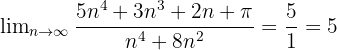 Wie man sieht, ist der Grad des Polynoms von Zähler und Nenner 4, daher ist der Grenzwert der Quotient der Koeffizienten der Monome höheren Grades, d.h.:
