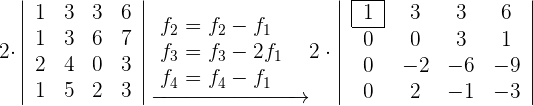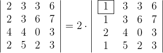 b Dividiert man die Zeile (oder die Spalte) durch eines ihrer Elemente, so muss man die Determinante mit diesem Element multiplizieren, damit sich ihr Wert nicht ändert. Das heißt, wir nehmen einen gemeinsamen Faktor in einer Zeile (oder einer Spalte) aus einem ihrer Elemente.