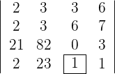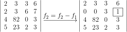 1 Wenn ein Element der Determinante den Wert 1 hat, wird eine der beiden Zeilen gewählt: die Zeile oder die Spalte, die dieses Element enthält (man muss diejenige wählen, die die größtmögliche Anzahl von Nullelementen enthält).