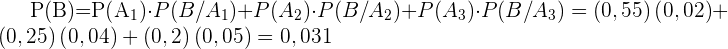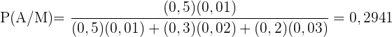 In einer Fabrik arbeiten drei Mitarbeiter: Andreas, Beto und Carlos. Andrés ist zu 50%, Beto zu 30% und Carlos zu 20% an der Produktion beteiligt.Bei Andreas liegt die Wahrscheinlichkeit bei 1%, dass er etwas falsch macht; bei Beto liegt die Wahrscheinlichkeit bei 2% und bei Carlos liegt sie bei 3%. Eines der Produkte wurde getestet und war fehlerhaft. Wie hoch ist die Wahrscheinlichkeit, dass es Andreas war, der den Fehler gemacht hat?
