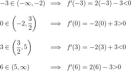 4 Wir nehmen einen Wert auf jedem Intervall (du kannst jeden Wert im Intervall nehmen) und bestimmen das Vorzeichen, das er in der 1. Ableitung hat.