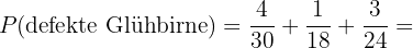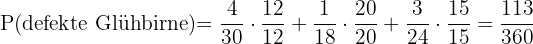 Die Wahrscheinlichkeit, eine durchgebrannte Glühbirne zu ziehen, ist die Summe der Wahrscheinlichkeiten, eine durchgebrannte Glühbirne aus jeder Schachtel zu ziehen, und kann wie folgt berechnet werden: