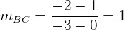 Um die Gleichung einer Geraden zu berechnen, müssen wir ihre Steigung und einen Punkt kennen, durch den sie verläuft. EIm Falle der durch A verlaufenden Höhe kennen wir ihre Steigung nicht, aber wir wissen, dass sie senkrecht auf der gegenüberliegenden Seite (Seite BC) steht. Wir ermitteln also zunächst die Steigung der Seite BC.