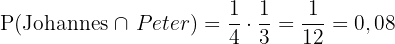 Die Wahrscheinlichkeit ist, dass entweder Johannes oder Peter trifft, abzüglich der Wahrscheinlichkeit, dass beide gleichzeitig treffen.