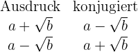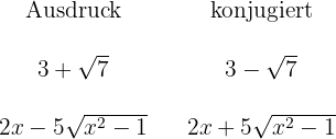 Man beachte, dass ein irrationaler Ausdruck, multipliziert mit dem konjugierten Wert, eine Differenz von Quadraten ergibt