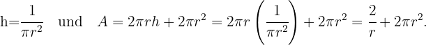 Aus dieser Aussage können wir schließen, dass wir die Funktion minimieren müssen, die die Fläche der zylindrischen Dose definiert, die durch gegeben ist. Da die Dose ein Fassungsvermögen von einem Liter haben muss, ist ihr Volumen gleich