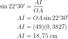 Wir berechnen den Sinus des Winkels . Hierfür nutzen wir den Wert des Winkels und die Hypotenuse (Radius des Achtecks) sowie die Kathete (die Hälfte der Seite des Achtecks). So können wir schließlich die Kathete