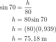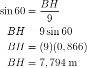 Wir sehen, dass die Höhe unser ursprüngliches Dreieck in zwei rechtwinklige Dreiecke teilt. Wir nehmen das rechte Dreieck, da wir mehr darüber wissen, um die Höhe und schließlich die Fläche zu berechnen. Für die Höhe nutzen wir den Sinus des Winkels , die zu diesem Dreieck gehörende Kathete und die Höhe, die wir so schließlich berechnen können: