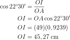 Wir berechnen den Kosinus des Winkels . Hierfür nutzen wir den Winkel und die Hypotenuse (den Radius des Achtecks) und die Kathete (das Apothema), um schließlich die Kathete