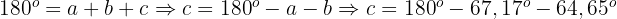 zu ermitteln, können wir dasselbe Verfahren wie bei den vorherigen Winkeln anwenden, aber wir nutzen die Tatsache, dass die Summe der Innenwinkel eines Dreiecks gleich