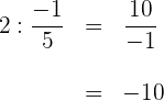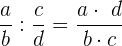 Das Ergebnis der Division von zwei rationalen Zahlen ist wiederum eine rationale Zahl, deren Zähler durch Multiplikation der äußerden Werte und deren Nenner durch Multiplikation der mittleren Werte erhalten wird
