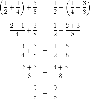 2 Assoziativ. Die Addition der ersten beiden Zahlen und die Addition einer dritten Zahl zu diesem Ergebnis ist dasselbe wie die Addition des Ergebnisses der Addition der zweiten und dritten Zahl zur ersten Zahl.