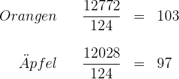 Orangen in Kisten verpacken, so dass jede Kiste die gleiche Anzahl von Äpfeln oder Orangen und so viele wie möglich enthält. Bestimme die Anzahl der Orangen in jeder Kiste und die Anzahl der benötigten Kisten.
