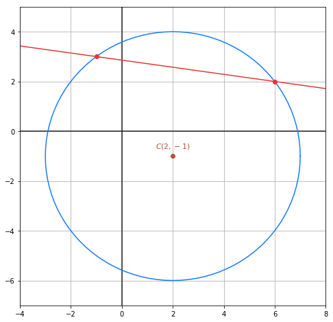 Q (6, 2) und P (-1, 3) sind somit die Schnittpunkte zwischen Gerade und Kreis. Die Gerade ist also eine Sekante des Kreises, wie in der folgenden Grafik zu sehen ist.
