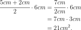 Zunächst sei daran erinnert, dass die Fläche eines Trapezes berechnet werden kann, wenn man die kleinere Grundseite, die größere Grundseite und die Höhe kennt. In diesem Fall beträgt die größere Grundseite 5 cm, die kleinere Grundseite 2 cm und die Höhe 6 cm. Der Flächeninhalt ist also