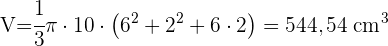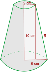 Berechne die Seitenfläche, die Gesamtfläche und das Volumen eines Kegelstumpfes mit den Radien 6 und 2 cm und der Höhe 10 cm.