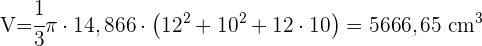Berechne die Seitenfläche, die Gesamtfläche und das Volumen des Kegelstumpfs mit den Radien 12 und 10 cm und der Mantellinie 15 cm.