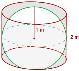 Berechne die Fläche und das Volumen einer Kugel, die in einen 2 m hohen Zylinder eingeschrieben ist.