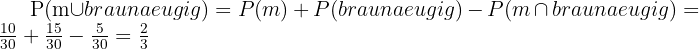 Hier muss man unterscheiden, dass es insgesamt 10 Männer gibt, insgesamt 15 Personen mit braunen Augen und insgesamt 5 Männer mit braunen Augen, um die Wahrscheinlichkeit zu berechnen:
