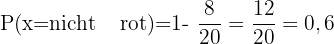 Um die Wahrscheinlichkeit zu erhalten, dass die Kugel NICHT rot ist, können wir von der Gesamtzahl (1), die Wahrscheinlichkeit, dass man eine rote Kugel erhält, abziehen: