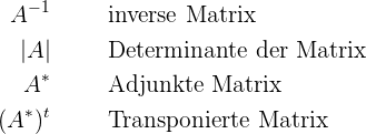Die Berechnung einer inversen matrix mit Determinanten sieht wie folgt aus: