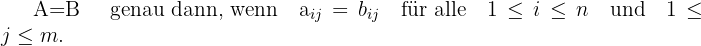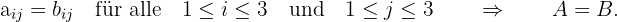 angegeben. - Zwei Matrizen sind genau dann gleich, wenn sie dieselbe Dimension haben und alle Elemente, die in beiden denselben Platz einnehmen, gleich sind. Das heißt, wenn