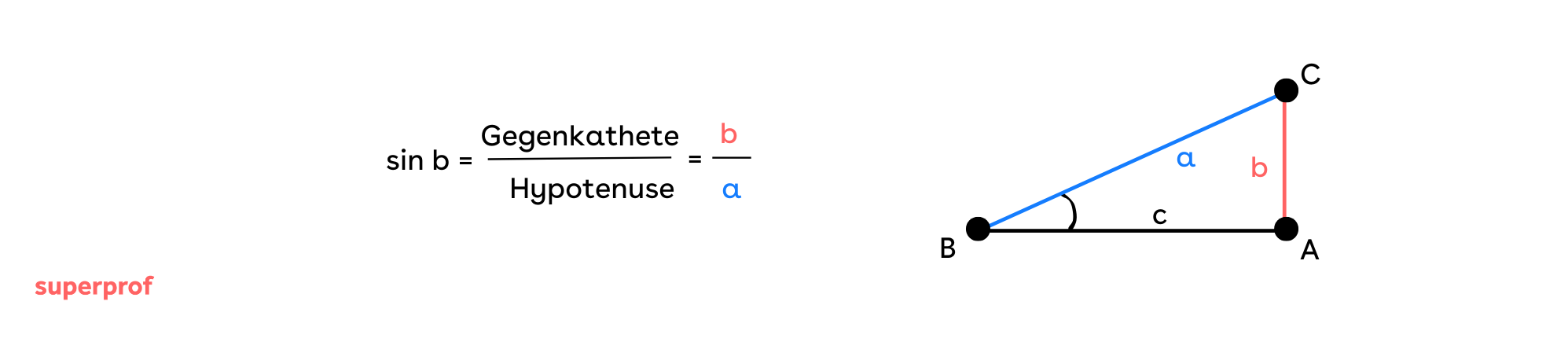 Der Sinus des Winkels B ist das Verhältnis der Länge der Gegenkathete zur Länge der Hypotenuse. Die Bezeichnung lautet sin b.