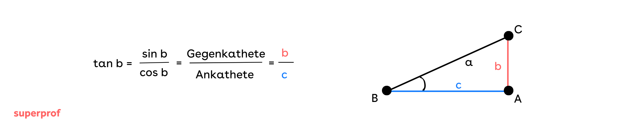 Der Tangens des Winkels B ist das Verhältnis der Länge der Gegenkathete zur Länge der Ankathete.