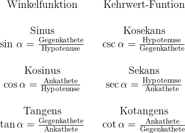 Eine Hilfestellung ist, sich zu merken, dass der Kosekans, der Sekans und der Kotangens die Kehrwertfunktion von Sinus, Kosinus und Tangens sind. Sieh dir hierzu folgende Tabelle an:
